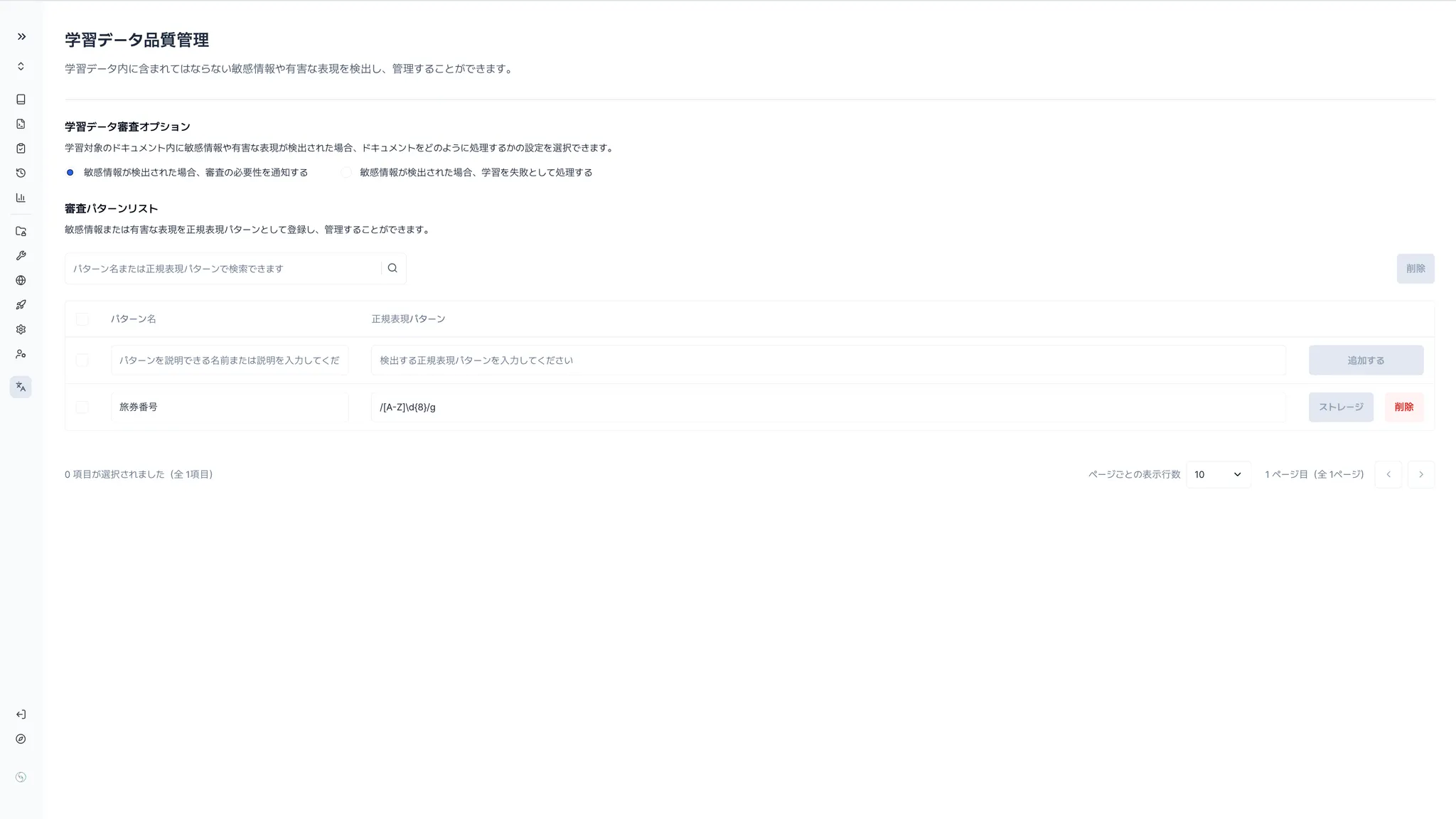 学習前にナレッジ内の機密情報を検出した場合の動作方針を以下の2つから選択できます: