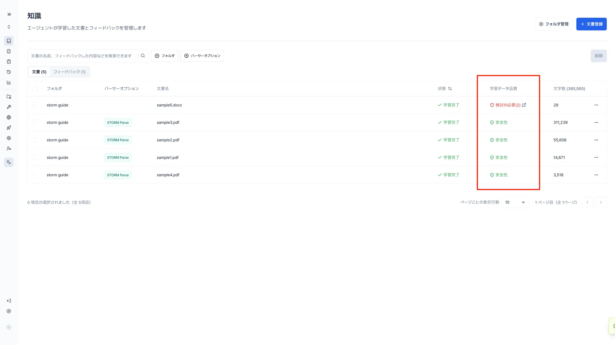 登録したパターンに該当する内容が検出された場合、該当ナレッジは一覧上の**「学習データ品質」列にフラグ表示**されます。