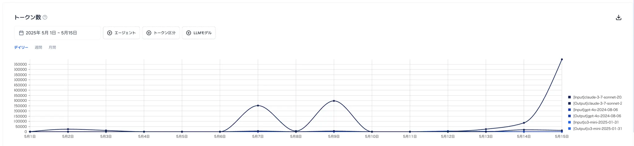 コンソールのダッシュボードページでは、チーム内のすべてのエージェントにおける呼び出し回数や使用トークン数を一目で確認できます。