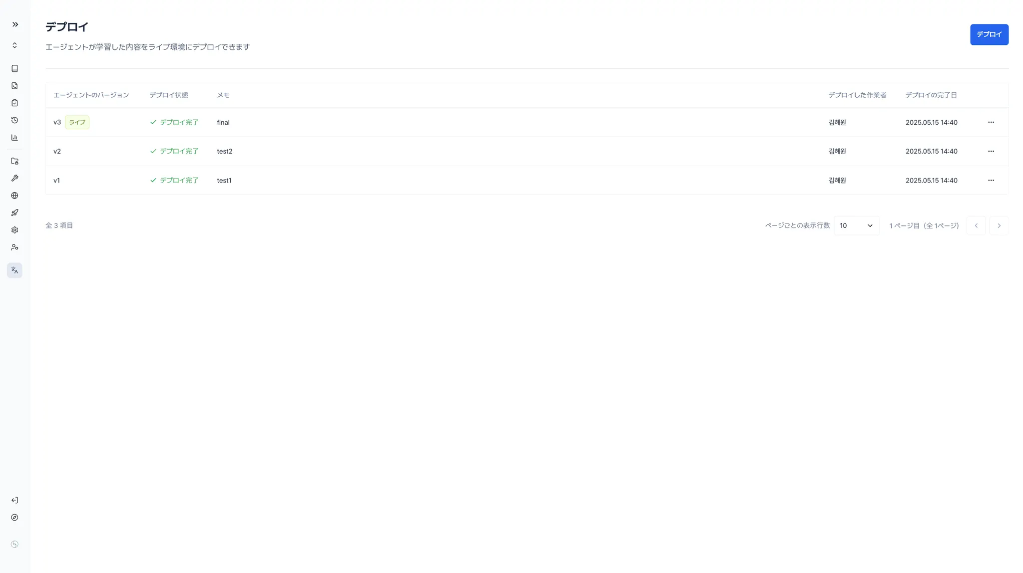 デプロイページは、テストを完了したエージェントを本番環境(Live環境)に安定的に適用するための最終ステップです。