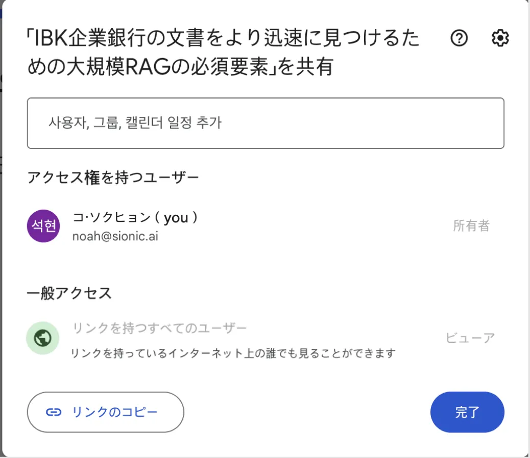Googleドライブのリンクでドキュメントをご登録いただく際は、**共有設定が「リンクを知っている全員に閲覧を許可」**になっていることをご確認ください。