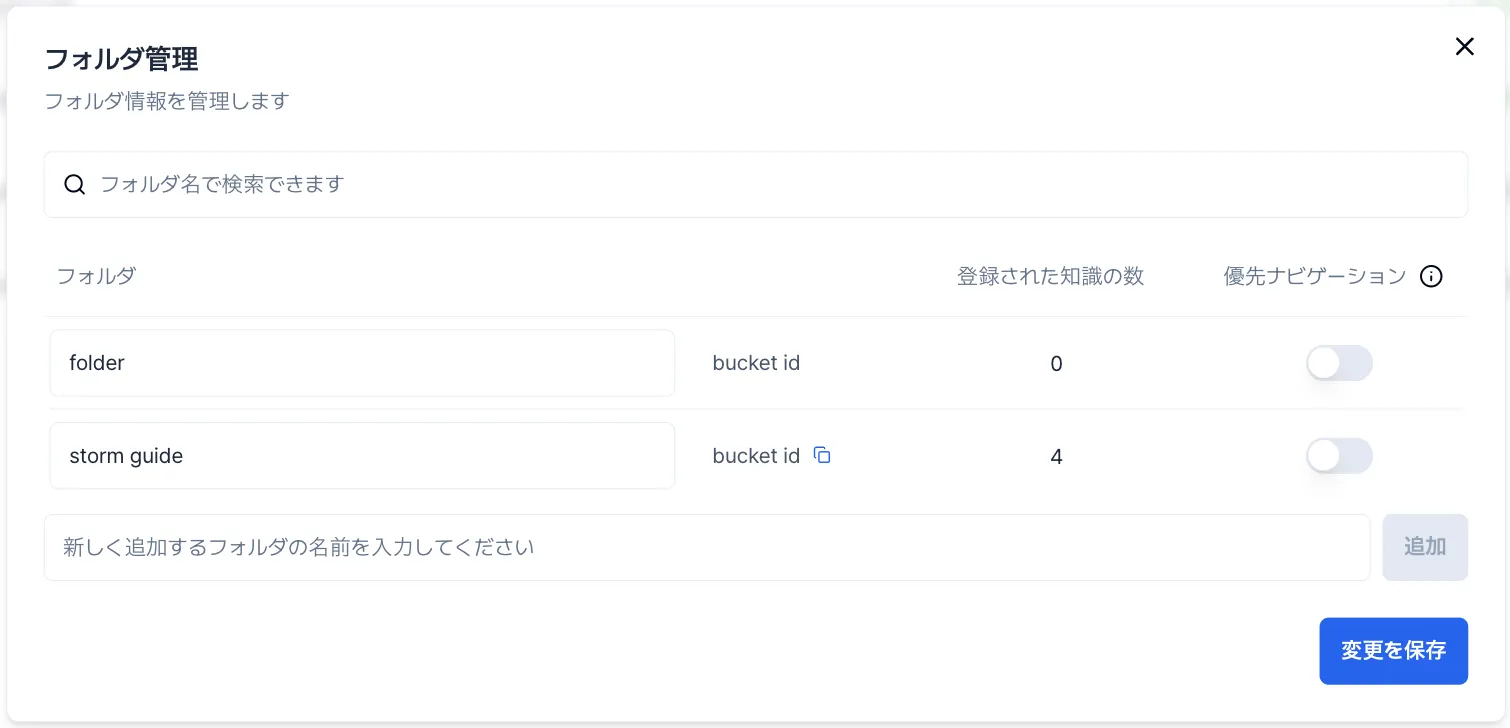 フォルダは、大量のナレッジデータを論理的に整理・構造化し、AIエージェントの回答の精度と関連性を向上させるための重要な機能です。