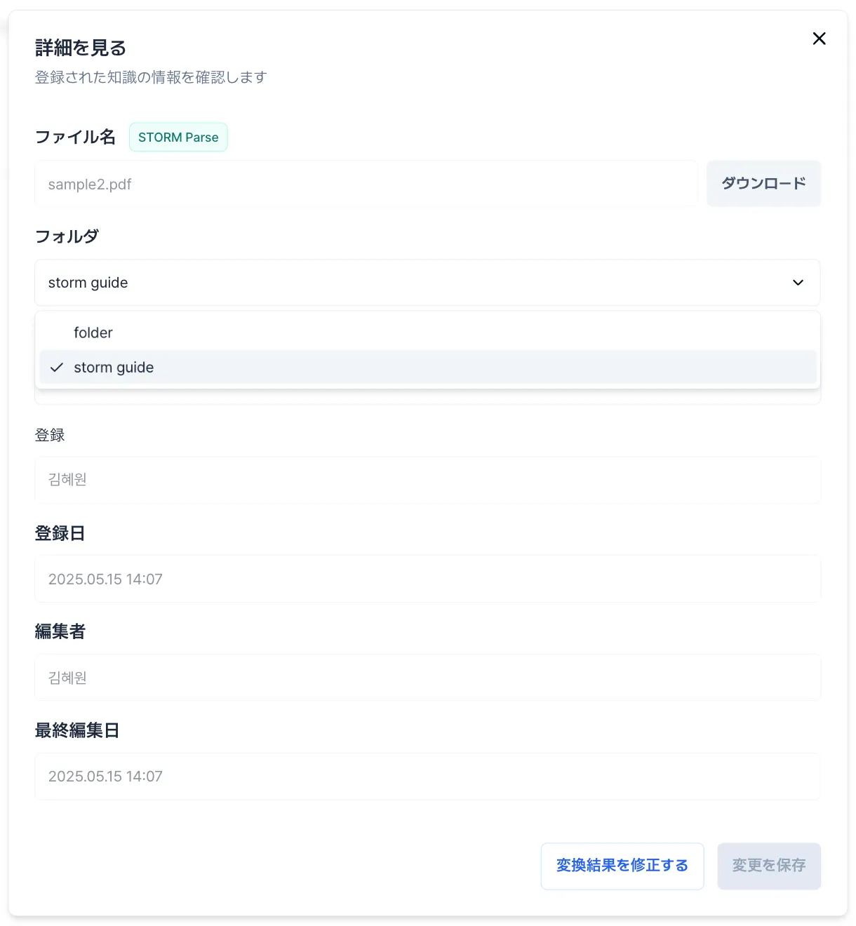 登録済みドキュメントの保存フォルダを変更したい場合は、詳細ページにて対象フォルダを再指定し、保存してください。