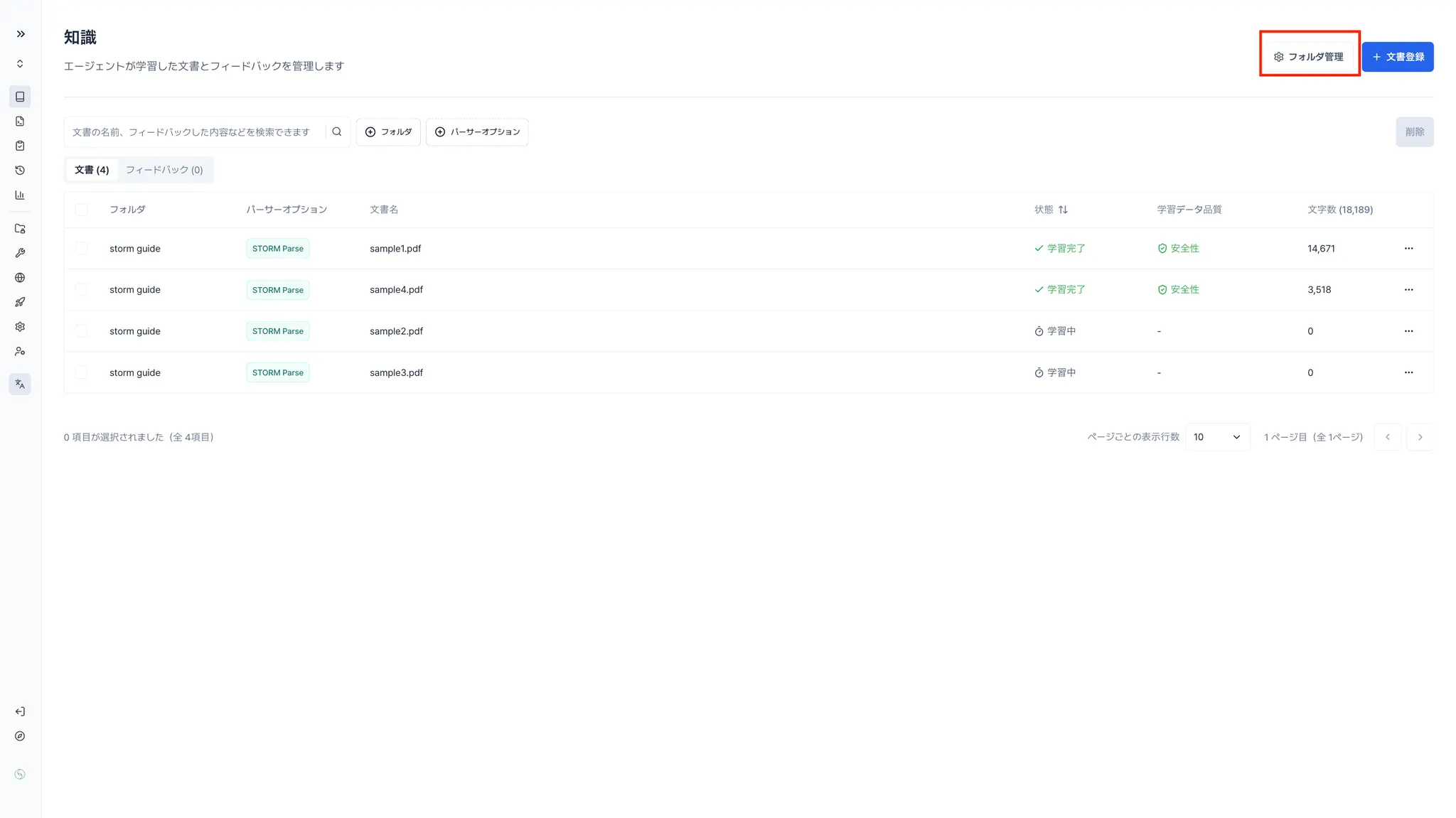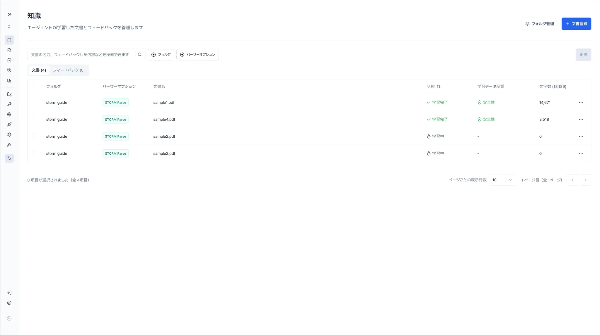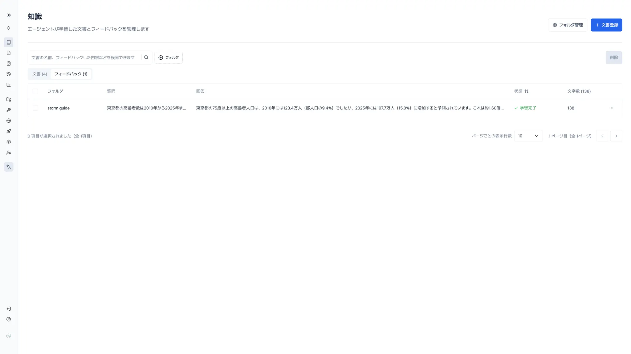 ナレッジページでは、エージェントに学習させるドキュメントとフィードバックを管理します。