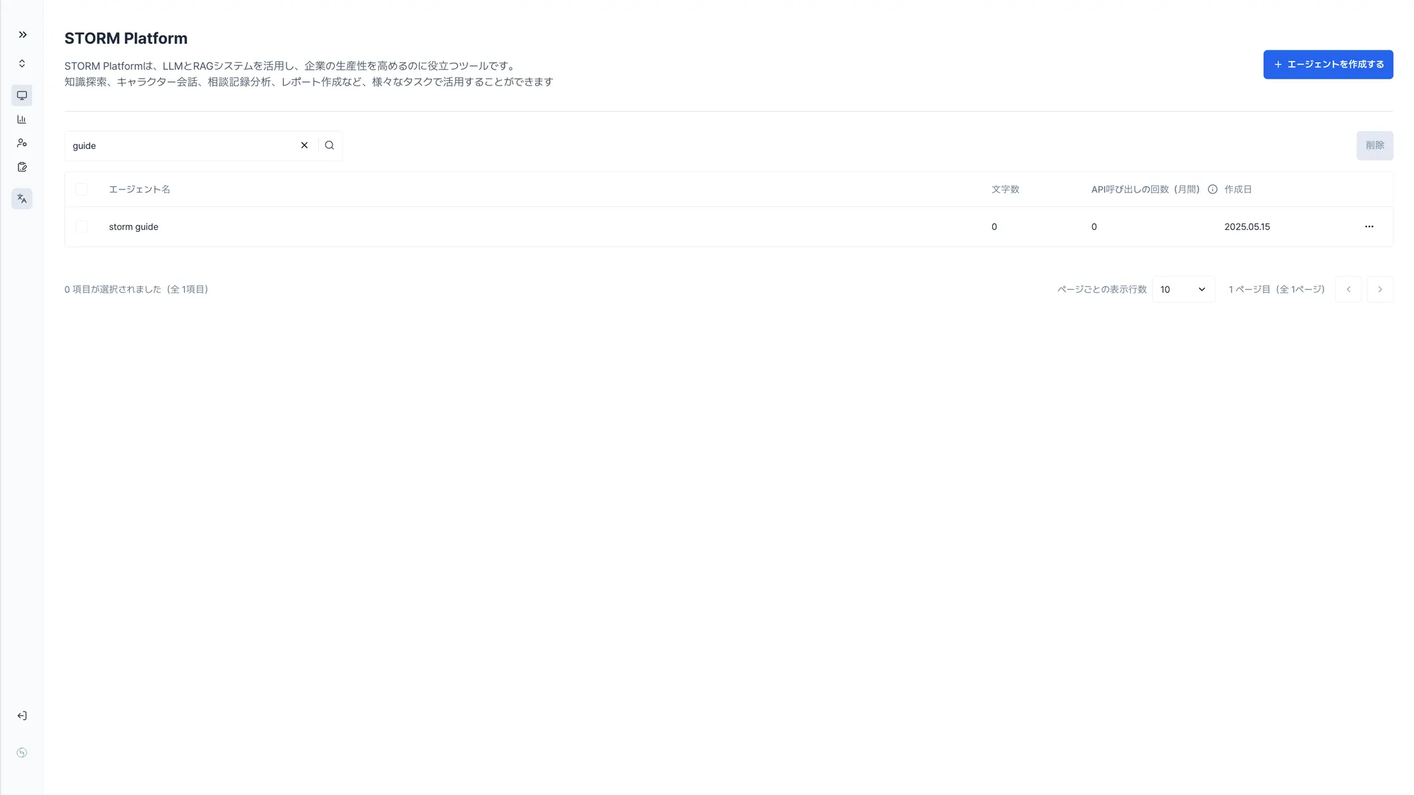 エージェント管理ページでは、エージェントの一覧を管理したり、新しいエージェントを作成することができます。