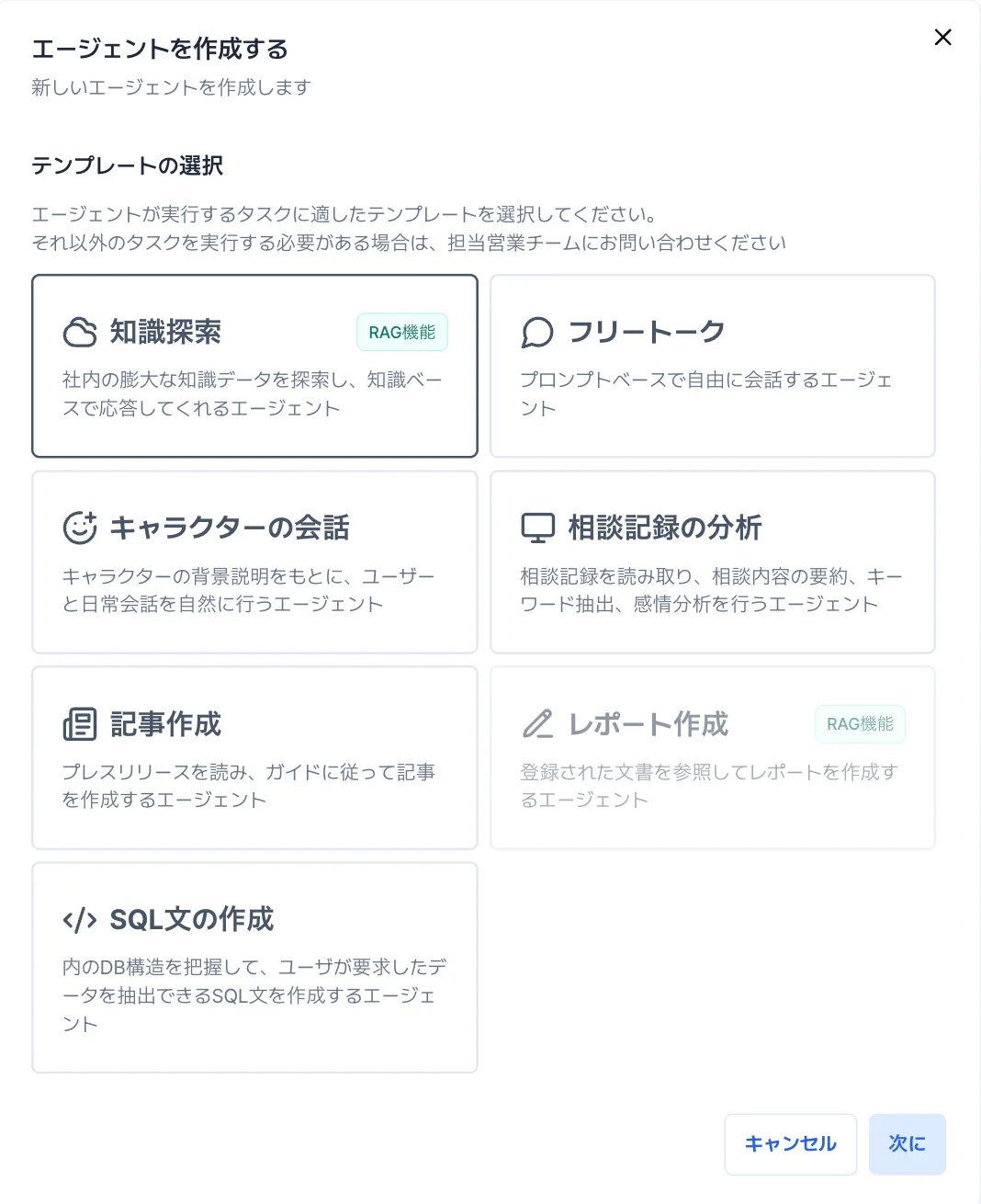 エージェントが担当するタスクの特性に応じて、あらかじめ用意されたテンプレートをご活用いただくことで、スムーズに作成を始めることができます。