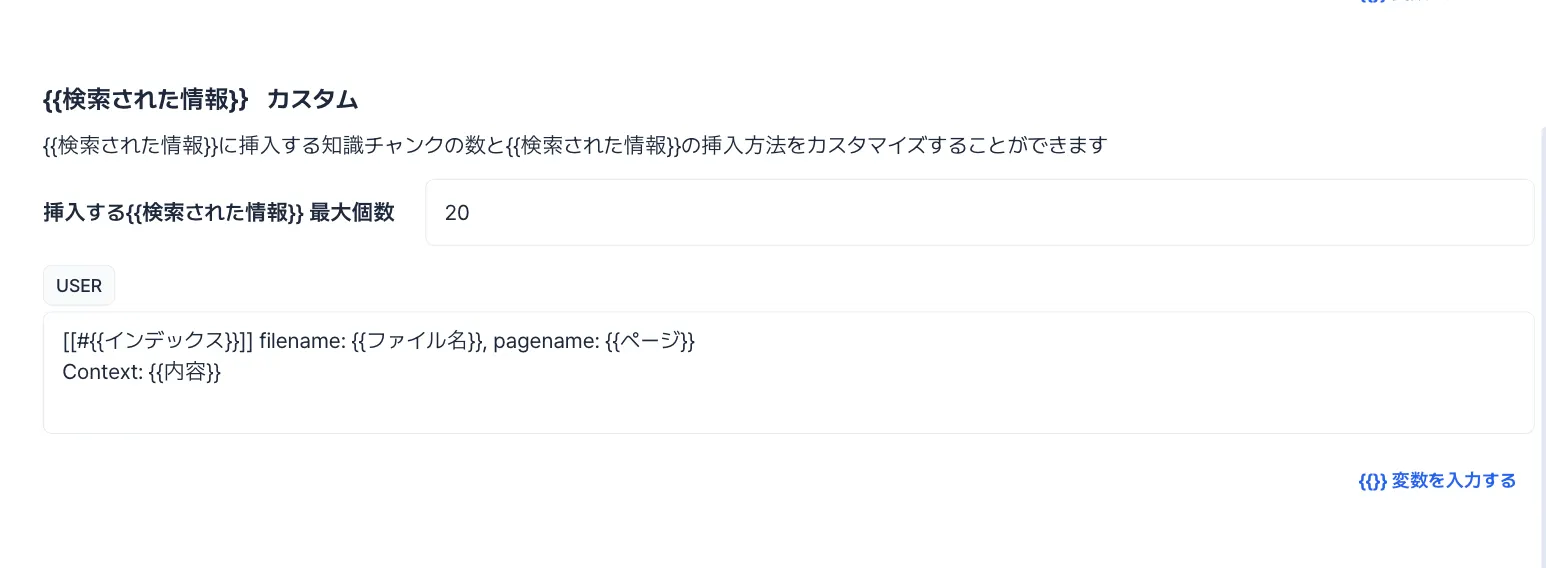 検索モジュール(RAG)を利用するエージェントにおいてのみ使用可能な変数です。