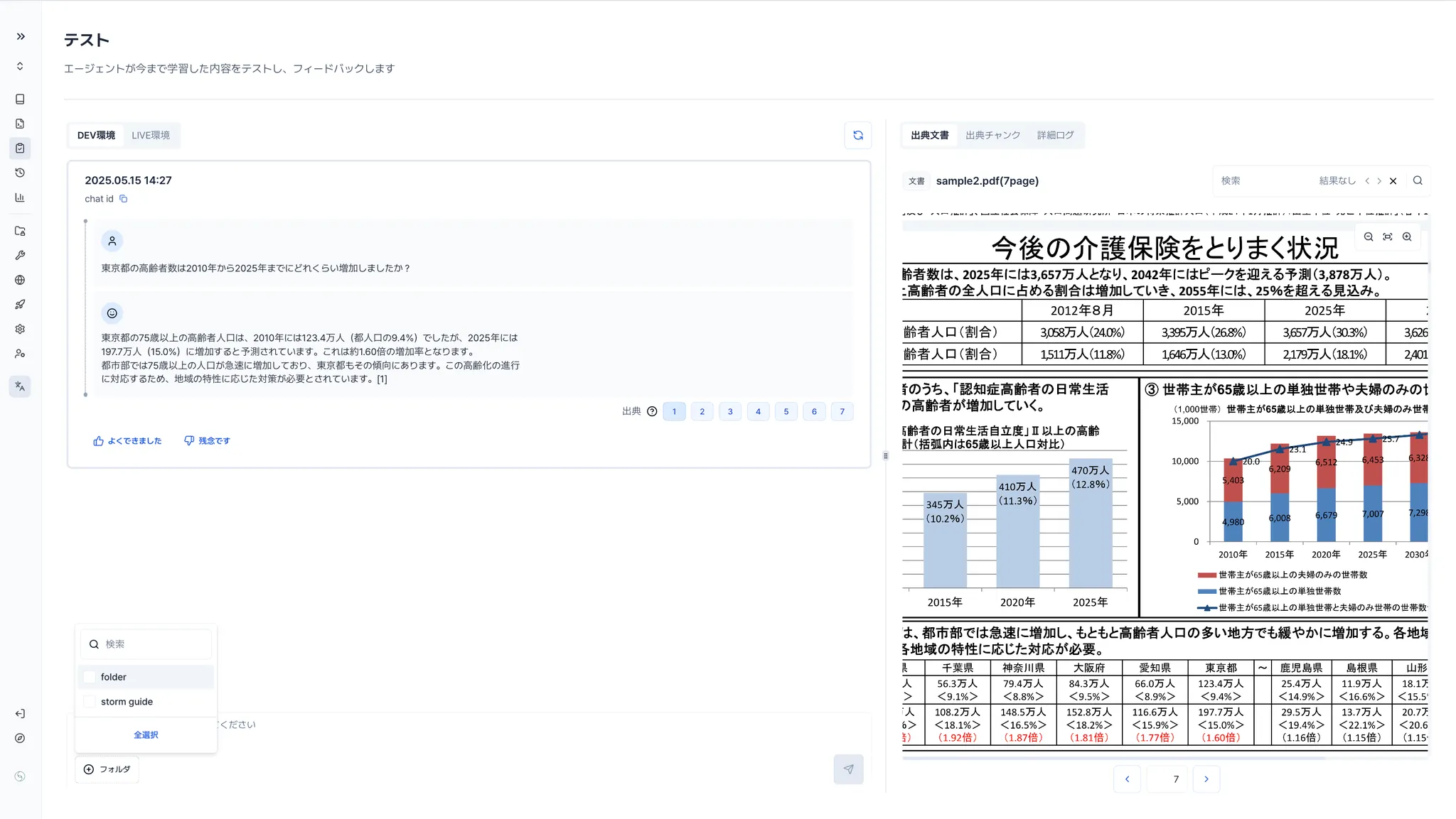 この場合、選択されたフォルダ内のドキュメントのみを参照して、エージェントが応答を生成します。